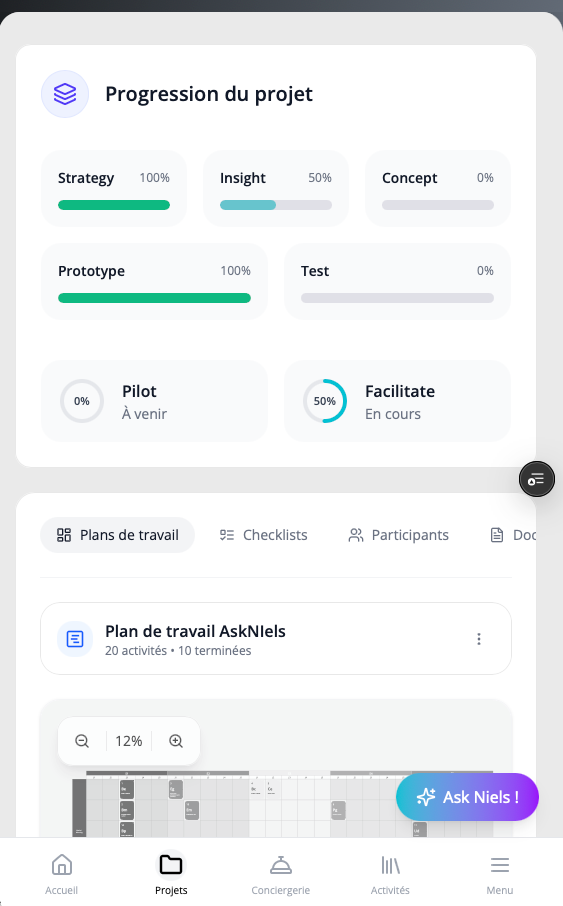 Niels a transformé 20 ans d'expertise en une plateforme guidée et intelligente. Plus de 50 ateliers éprouvés sur 500+ projets, une IA qui connaît la méthode par cœur, et tous vos outils centralisés.