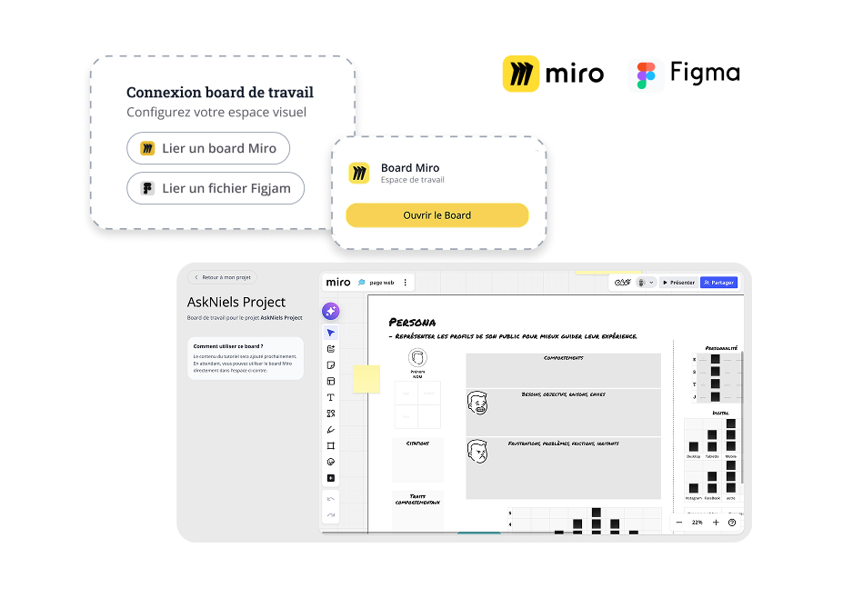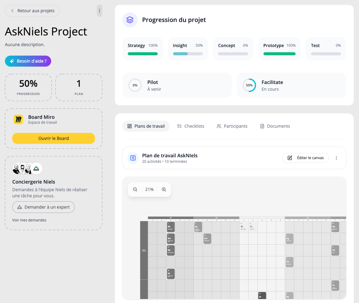 Sélectionnez les activités recommandées créez votre propre plan, ou laissez Niels faire. Assignez vos équipes. Définissez les échéances. Intégrez et travailler directement dans vos boards Miro. Tout est structuré, visible et accessible au même endroit.