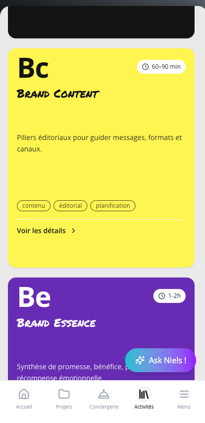 Niels a transformé 20 ans d'expertise en une plateforme guidée et intelligente. Plus de 50 ateliers éprouvés sur 500+ projets, une IA qui connaît la méthode par cœur, et tous vos outils centralisés.