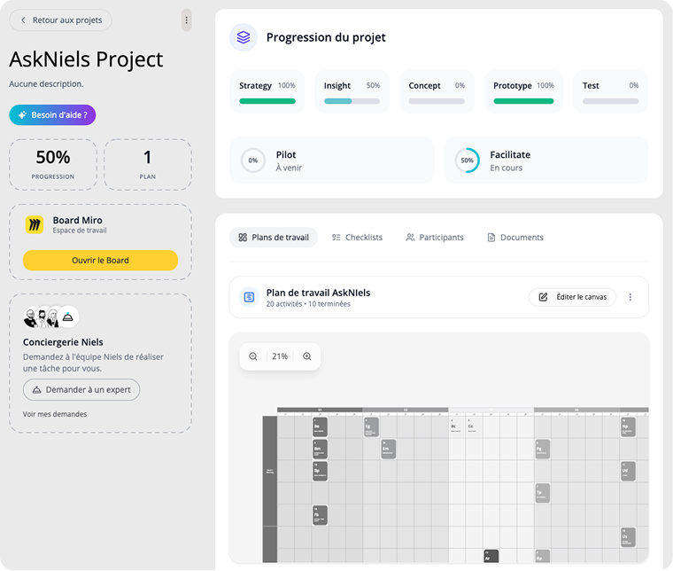 Sélectionnez les activités recommandées créez votre propre plan, ou laissez Niels faire. Assignez vos équipes. Définissez les échéances. Intégrez et travailler directement dans vos boards Miro. Tout est structuré, visible et accessible au même endroit.